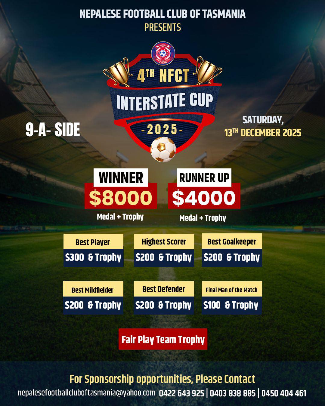 Organised by the Nepalese Football Club of Tasmania (NFCT), the event will take place on Saturday, 13th December 2025, featuring some of the strongest Nepalese community football clubs from across Australia.